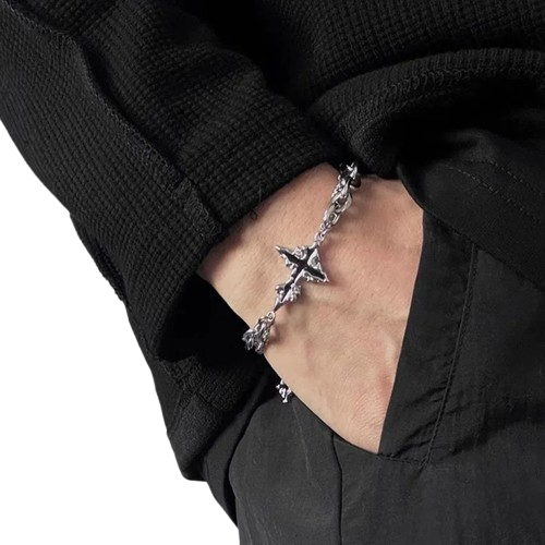 The Fallen Star Bracelet blends raw punk energy with a clean, modern edge. Crafted from durable stainless steel and titanium, its layered chain design and star details give it a worn-in, rebellious look that feels effortless on the wrist. Built for everyday wear, it’s a unisex piece that stands strong on its own or stacked with other chains for a heavier statement.